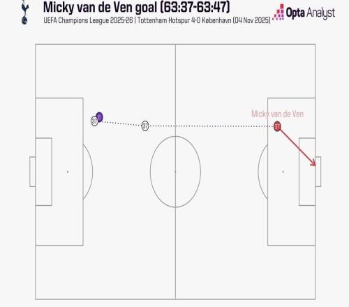 欧冠联赛阶段第四轮,热刺主场4-0大胜哥本哈根,热刺后卫范德芬在下半场长途奔袭打入一球,范德芬带球奔袭距离为6...