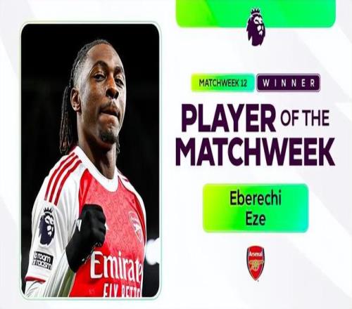 就在同一时间,英超官方宣布,阿森纳中场埃泽当选英超第12轮最佳球员。在阿森纳4-1大胜托特纳姆热刺的北伦敦德比中,埃泽迎来个人首次德比首发,便上演职业生涯首个帽子戏法,帮助球队取得英超时代对热刺的并列最大分差胜利。他也成为历史上第四位在各项赛事北伦敦德比中独中三元的球员。
